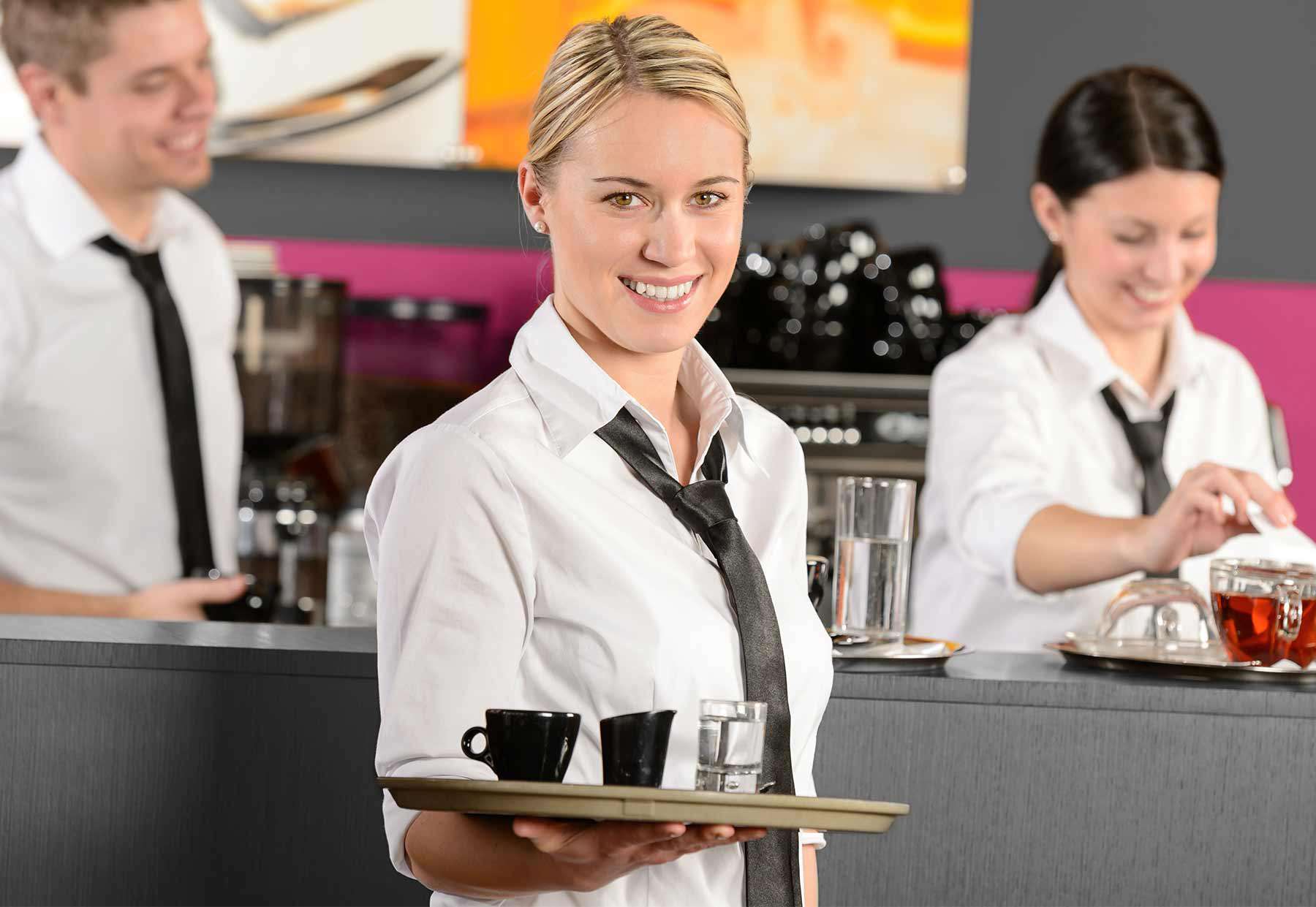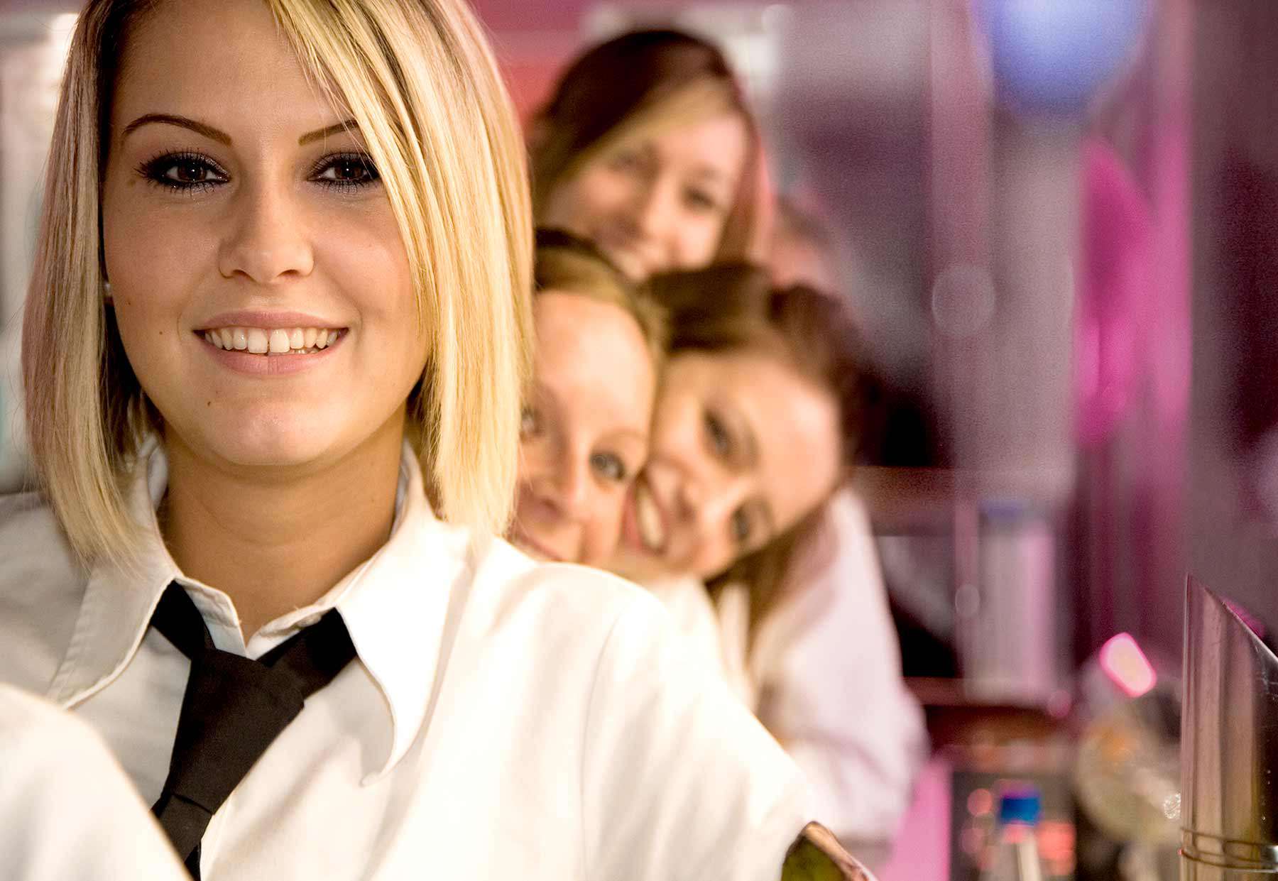Elegante Etui-Kleider, Kostüme oder klassisch-moderne Hosenanzüge. Ideal für Information und Gästebetreuung - Bistro